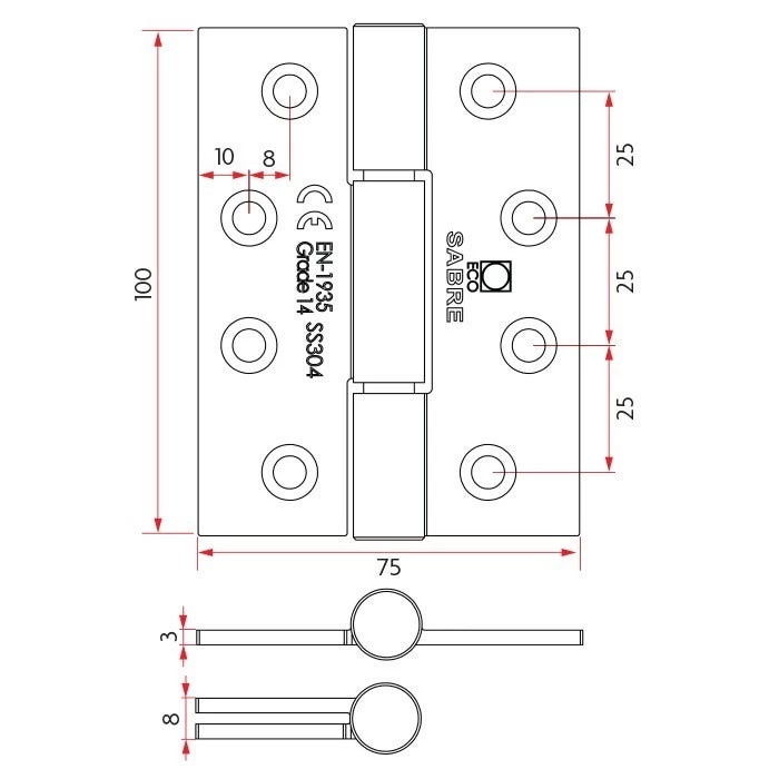 Sabre 75 x 100mm Ball Bearing Heavy Duty Hinge Stainless Steel